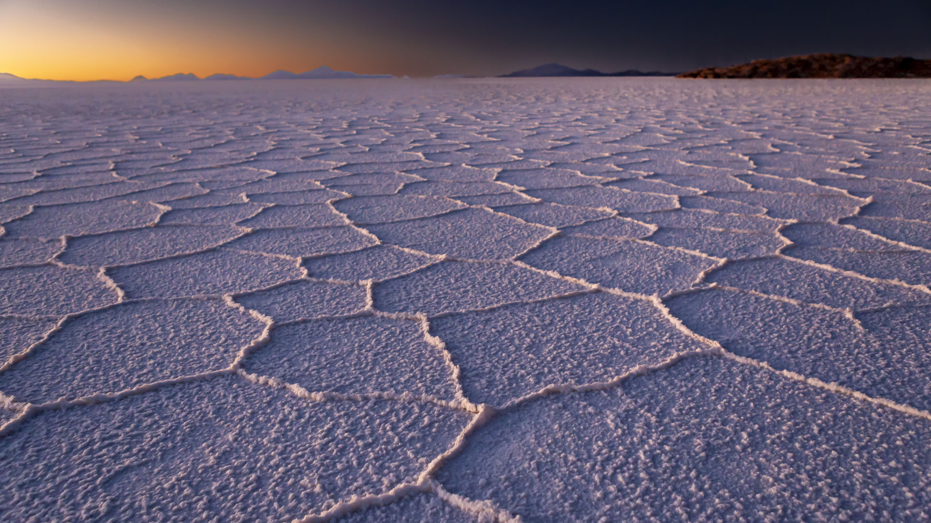 En Bolivie dans le Salar d’Uyuni un carrelage blanc de polygones de sel. Ces figures
